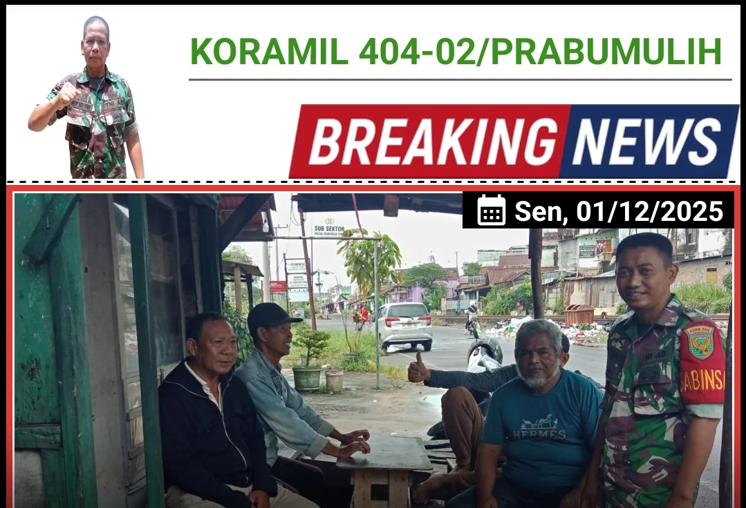 Kodam II/Sriwijaya, Prabumulih – Serda Engkus, Babinsa Desa Jungai yang merupakan bagian dari Koramil 404-02/Prabumulih Kodim 0404/Muara Enim, menunjukkan komitmennya dalam membina wilayah teritorial dengan melaksanakan kegiatan Komunikasi Sosial (Komsos) di Desa Jungai, Kecamatan Rambang Kapak Tengah (RKT), Kota Prabumulih, pada Senin (01/12/2025).