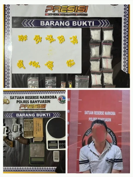 Banyuasin, Suryanews86.com – Satuan Reserse Narkoba (Satresnarkoba) Polres Banyuasin meringkus seorang bandar sekaligus pengedar narkotika jaringan lokal di Desa Tanjung III, Kecamatan Rantau Bayur, Kamis (20/11/2025) pagi. Pelaku berinisial C.A.U.B. (47) ditangkap beserta barang bukti puluhan gram sabu-sabu, ekstasi, hingga senjata api rakitan.