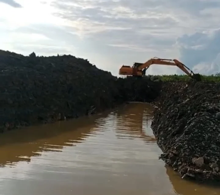 Saat ini, proses pelebaran aliran dan penataan lahan terus berlangsung. Alat berat terlihat bekerja menggali dan memperluas jalur air di sisi lahan yang dulunya merupakan area rawa.
