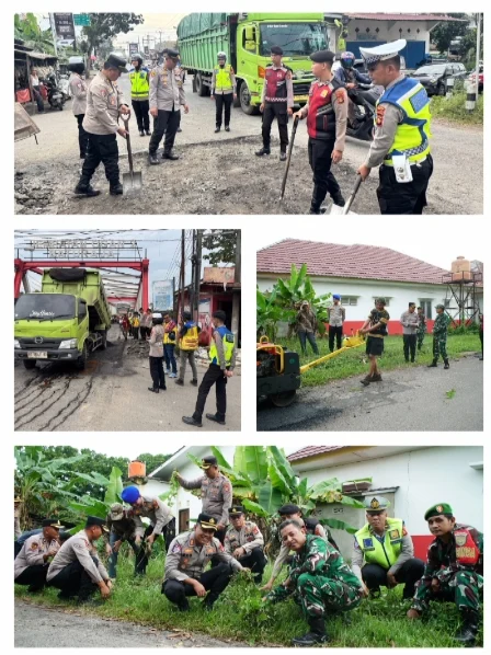 Selain penambalan jalan provinsi dan kabupaten, enam Polsek jajaran turut melaksanakan kegiatan serentak di wilayah masing-masing, mulai dari penyemenan jalan hingga pembersihan fasilitas umum.