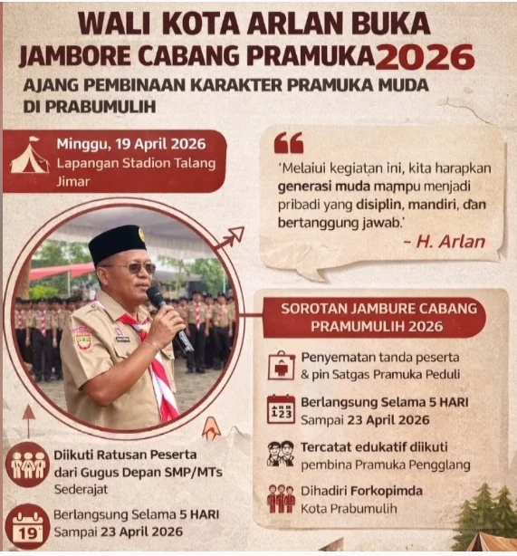 PRABUMULIH , Suryanews86.com – Wali Kota Prabumulih, H. Arlan, resmi membuka Jambore Cabang (Jamcab) Gerakan Pramuka Kota Prabumulih Tahun 2026 di Lapangan Stadion Talang Jimar, Minggu (19/4/2026).